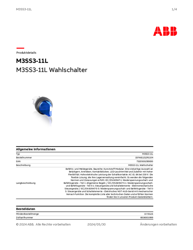 1SFA611212R1104 ABB 1SFA611212R1104 M3SS3-11L Podświetlany przełącznik wybierakowy przełącz...