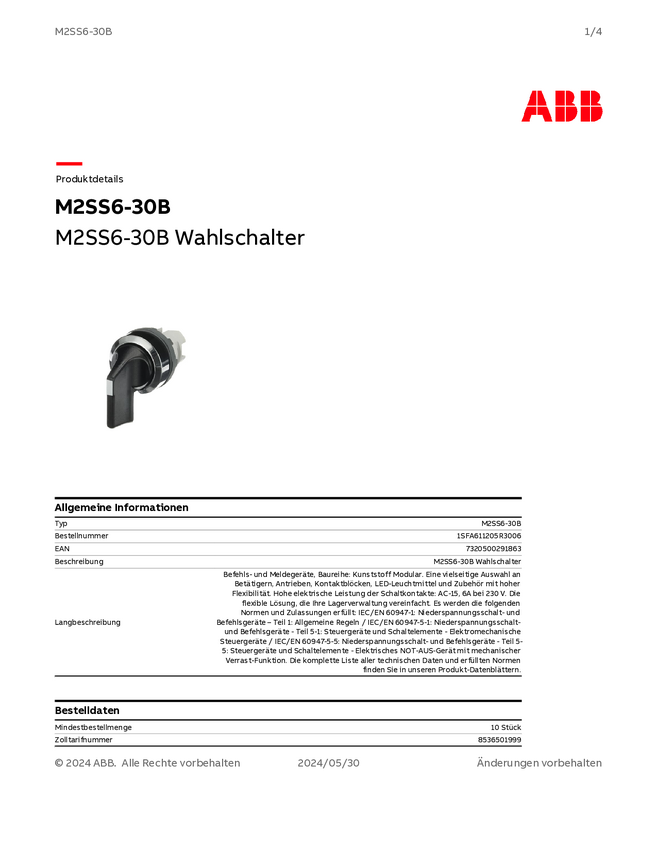 ABB 1SFA611205R3006 M2SS6-30B Mocowanie przełącznika wyboru przełącznik obrotowy 1 szt.