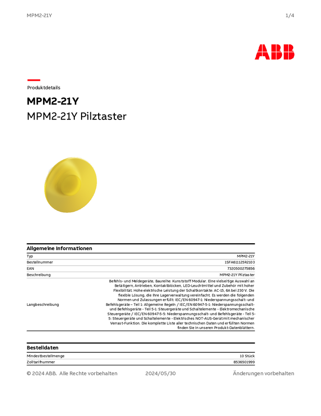 1SFA611125R2103 ABB 1SFA611125R2103 MPM2-21Y Podświetlany przycisk grzybkowy żółty 1 szt.