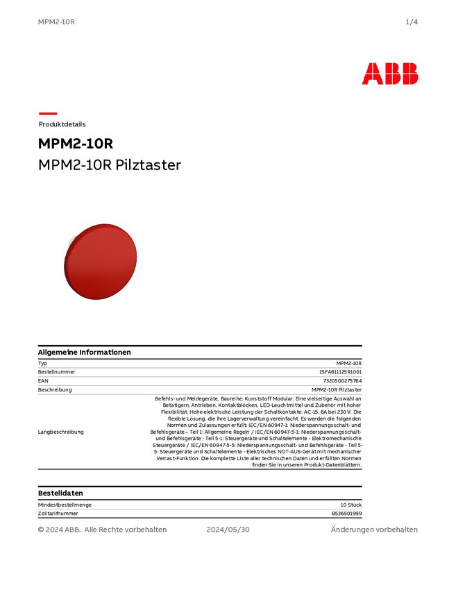 1SFA611125R1001 ABB 1SFA611125R1001 MPM2-10R Mocowanie przycisku grzybka czerwony 1 szt.