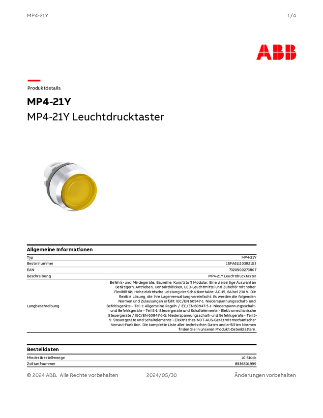 1SFA611103R2103 ABB 1SFA611103R2103 MP4-21Y Przycisk podświetlany żółty 1 szt.