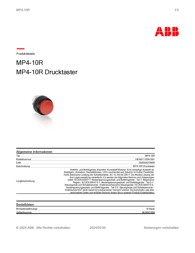1SFA611103R1001 ABB 1SFA611103R1001 MP4-10R Mocowanie za pomocą przycisku czerwony 1 szt.