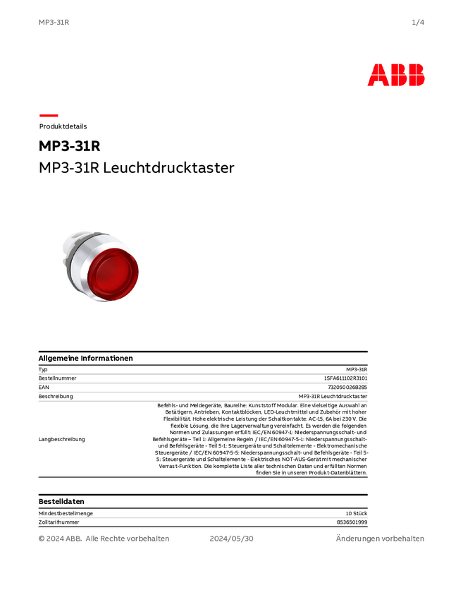 ABB 1SFA611102R3101 MP3-31R Przycisk podświetlany czerwony 1 szt.