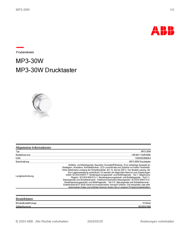 1SFA611102R3005 ABB 1SFA611102R3005 MP3-30W Mocowanie za pomocą przycisku biały 1 szt.