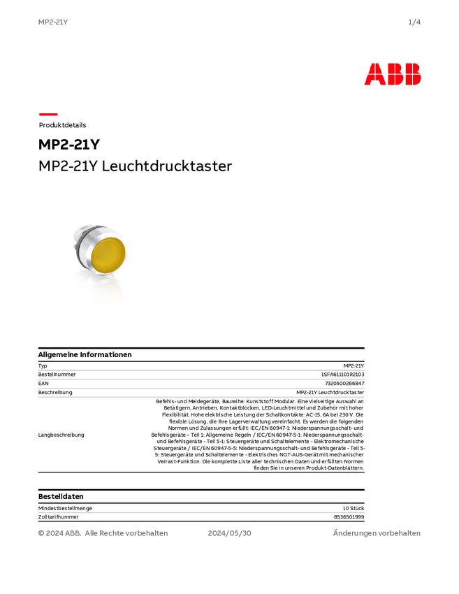 1SFA611101R2103 ABB 1SFA611101R2103 MP2-21Y Przycisk podświetlany żółty 1 szt.