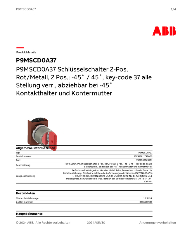 1SFA192117R9006 ABB 1SFA192117R9006 P9MSCD0A37 Przełącznik kluczykowy klucz 1 szt.