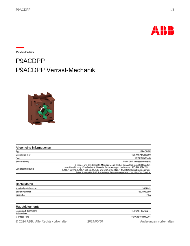 1SFA187843R8000 Mechanizm zatrzaskowy ABB P9ACDPP 1 szt.