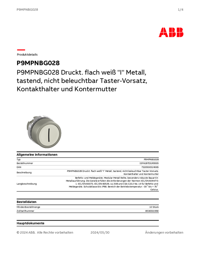 1SFA187151R9505 ABB 1SFA187151R9505 P9MPNBG028 Przycisk biały 1 szt.