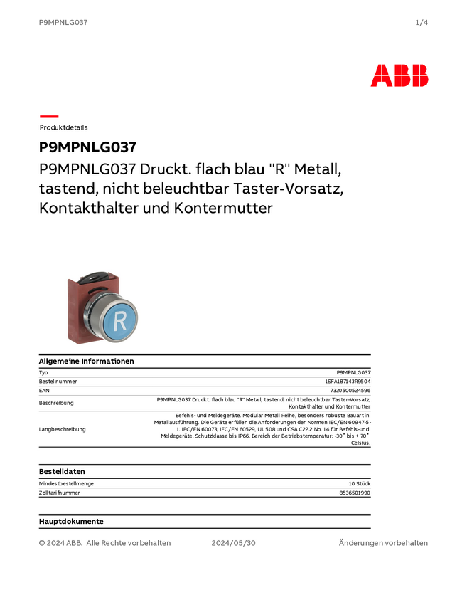 1SFA187143R9504 ABB 1SFA187143R9504 P9MPNLG037 Przycisk niebieski 1 szt.