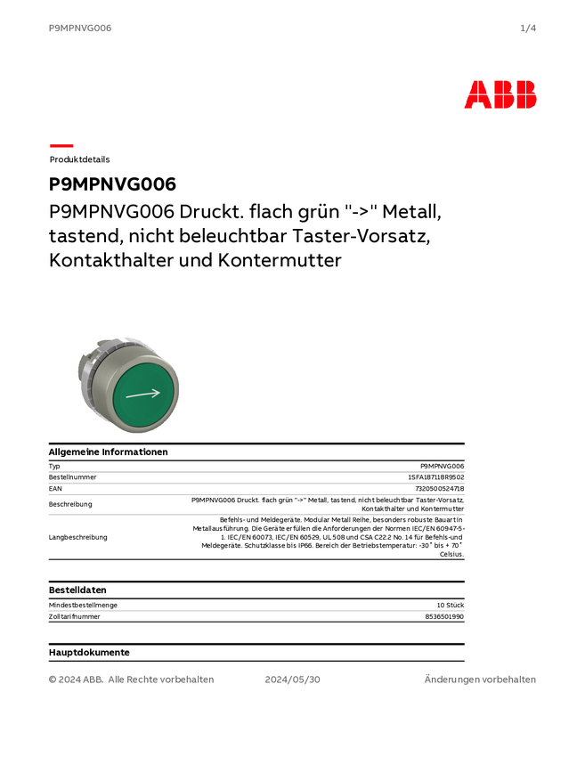 1SFA187118R9502 ABB 1SFA187118R9502 P9MPNVG006 Przycisk zielony 1 szt.