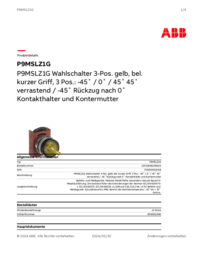 1SFA184613R9103 ABB 1SFA184613R9103 P9MSLZ1G Przełącznik wyboru przełącznik obrotowy 1 szt.