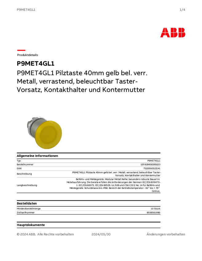 1SFA184563R9103 ABB 1SFA184563R9103 P9MET4GL1 Przycisk grzybkowy żółty 1 szt.