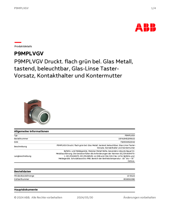 1SFA184522R9102 ABB 1SFA184522R9102 P9MPLVGV Przycisk zielony 1 szt.