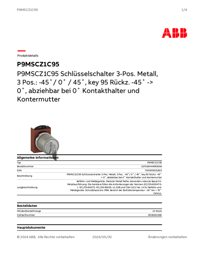 1SFA184449R9006 ABB 1SFA184449R9006 P9MSCZ1C95 Przełącznik kluczykowy klucz 1 szt.