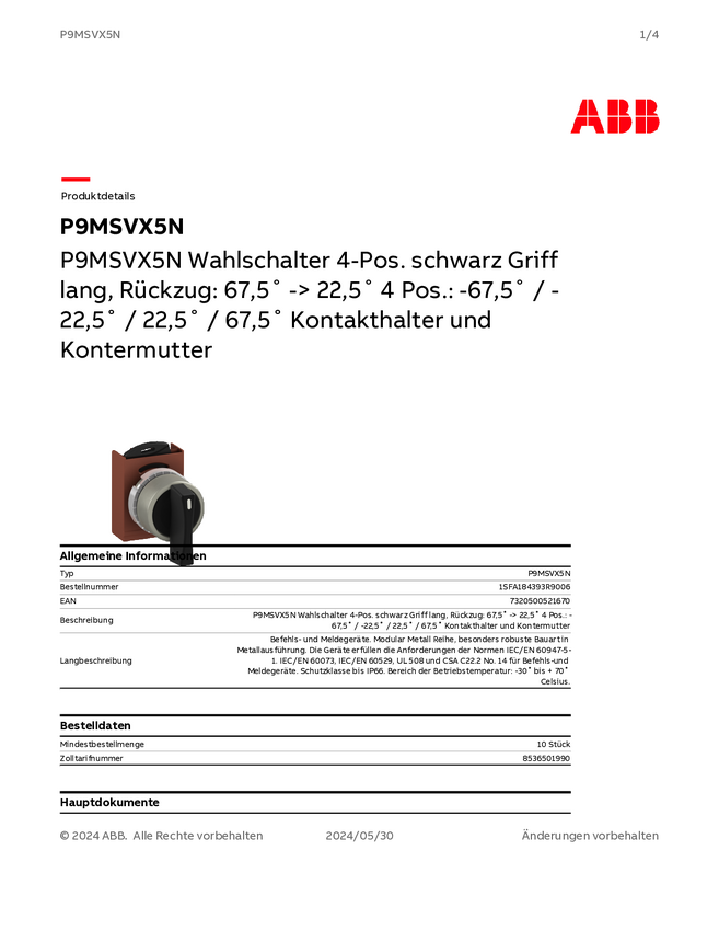 1SFA184393R9006 ABB 1SFA184393R9006 P9MSVX5N Przełącznik wyboru przełącznik obrotowy 1 szt.