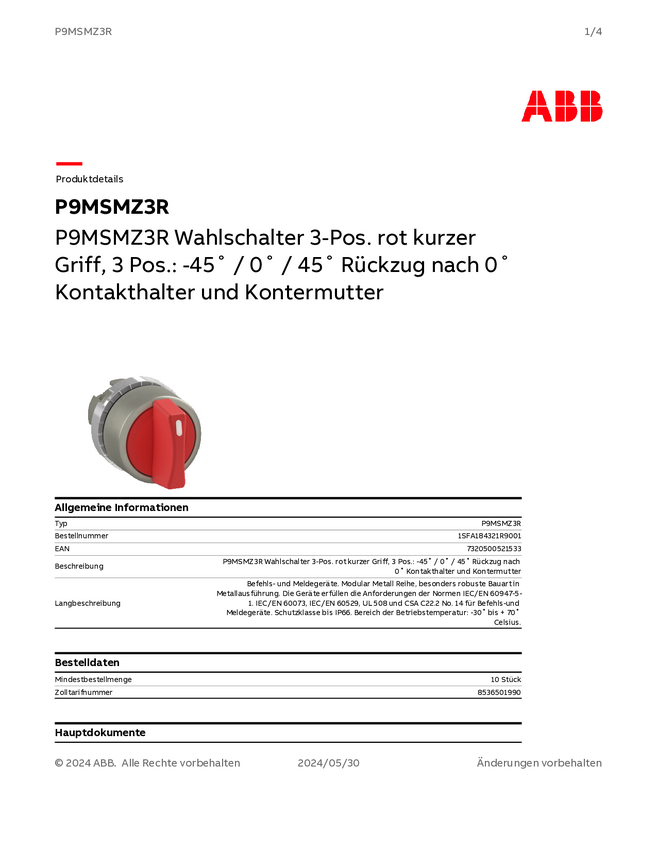 1SFA184321R9001 ABB 1SFA184321R9001 P9MSMZ3R Przełącznik wyboru przełącznik obrotowy 1 szt.