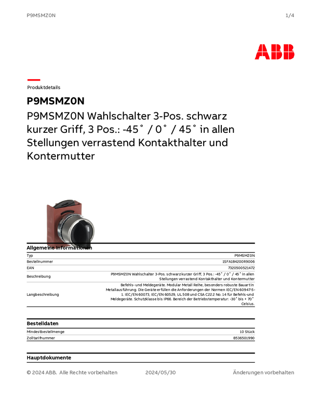 1SFA184200R9006 ABB 1SFA184200R9006 P9MSMZ0N Przełącznik wyboru przełącznik obrotowy 1 szt.