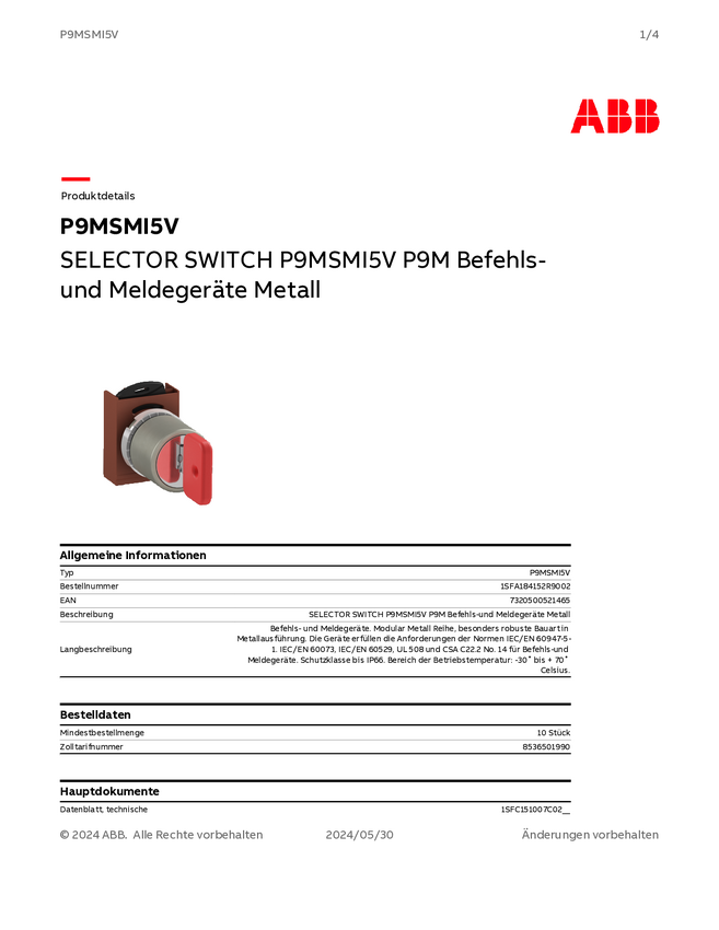 ABB 1SFA184152R9002 P9MSMI5V Przełącznik kluczykowy przełącznik obrotowy 1 szt.