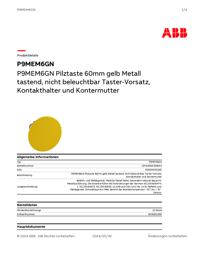 1SFA184053R9003 ABB 1SFA184053R9003 P9MEM6GN Przycisk grzybkowy żółty 1 szt.
