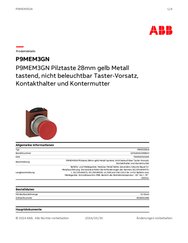 ABB 1SFA184033R9003 P9MEM3GN Przycisk grzybkowy żółty 1 szt.