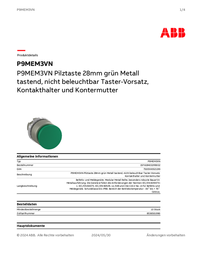 1SFA184032R9002 ABB 1SFA184032R9002 P9MEM3VN Przycisk grzybkowy zielony 1 szt.
