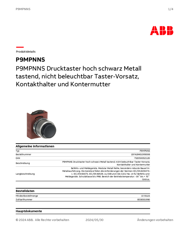 1SFA184010R9006 ABB 1SFA184010R9006 P9MPNNS Przycisk czarny 1 szt.