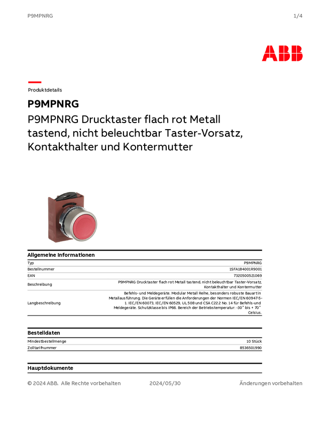 1SFA184001R9001 ABB 1SFA184001R9001 P9MPNRG Przycisk czerwony 1 szt.