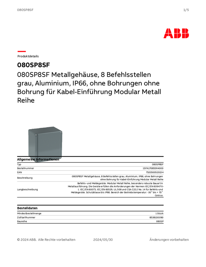1SFA170855R4000 Metalowa obudowa ABB 080SP8SF (S x W) 152 mm x 152 mm 1 szt.