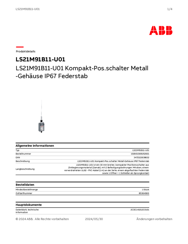 1SBV015691R2601 ABB 1SBV015691R2601 LS21M91B11-U01 Przełącznik pozycyjny 10 A trzpień zaokr...