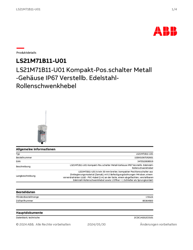 ABB 1SBV015671R2601 Przełącznik pozycyjny LS21M71B11-U01, 10 A, IP67, 1 szt.