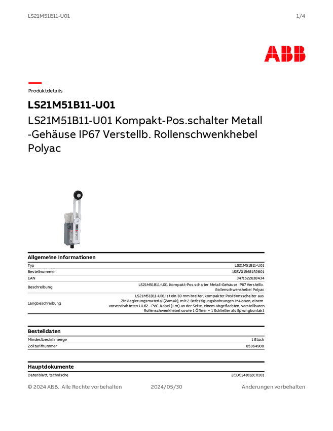 1SBV015651R2601 ABB 1SBV015651R2601 LS21M51B11-U01 Przełącznik pozycyjny 10 A trzpień zaokr...