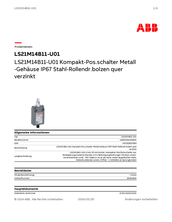 1SBV015614R2601 ABB 1SBV015614R2601 Przełącznik pozycyjny LS21M14B11-U01, 10 A, IP67, 1 szt...
