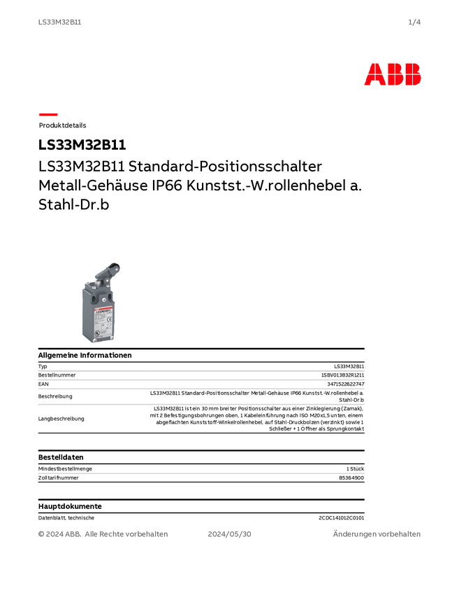 1SBV013832R1211 ABB 1SBV013832R1211 Przełącznik pozycyjny LS33M32B11, 10 A, IP66, 1 szt.