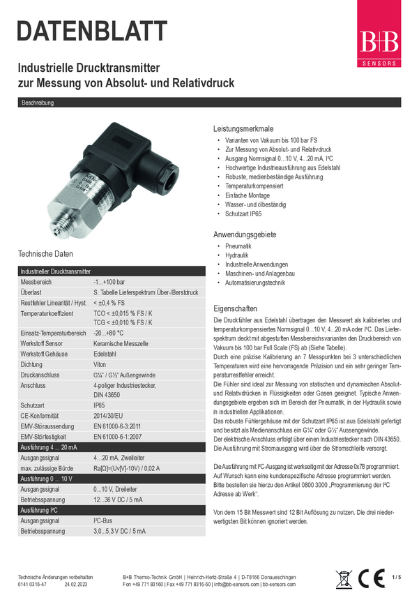 B + B Thermo-Technik Przetworniki ciśnienia 1 szt. 0550 1191-012 złącze zaworu ISO 4400