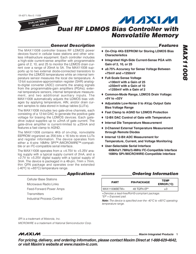 MAX11008 Dual RF LDMOS Bias Controller with Nonvolatile Memory