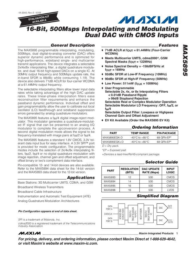 MAX5895 16-Bit, 500Msps Interpolating and Modulating Dual DAC with CMOS Inputs
