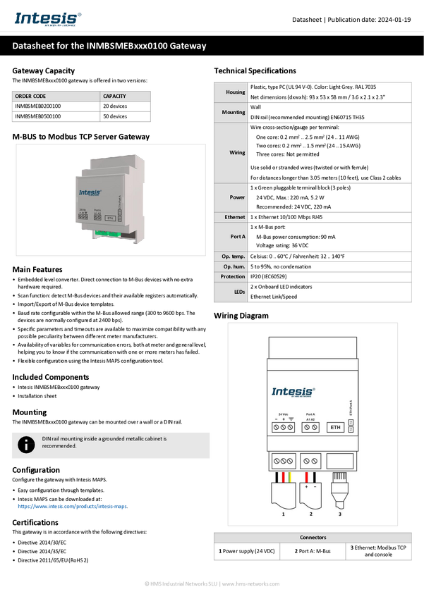 INMBSMEB0200100 Brama sieciowa Intesis INMBSMEB0200100 M-Bus, Modbus-TCP, RJ-45 24 V/DC