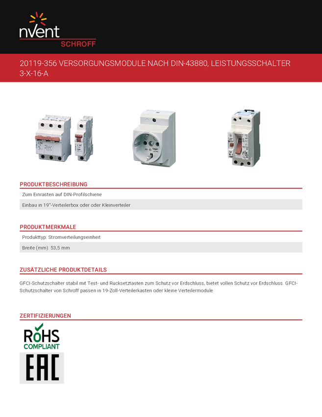 20119356 Wyłącznik zasilania nVent SCHROFF 20119356 Zakres ustawienia (Prąd): 16 A (...