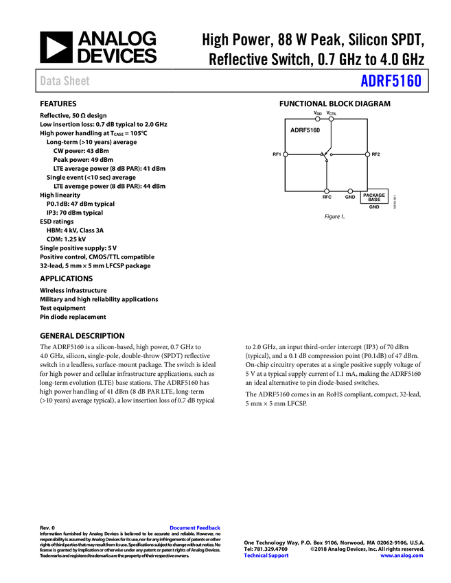 ADRF5160 High Power, 88 W Peak, Silicon SPDT, Reflective Switch, 0.7 GHz to 4.0 GHz