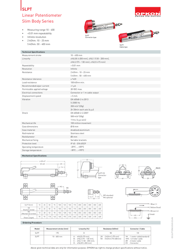 SLPT-200-D-5K-1M Transduktor Opkon SLPT-200-D-5K-1M, 28 V/DC, Długość skoku 200 mm