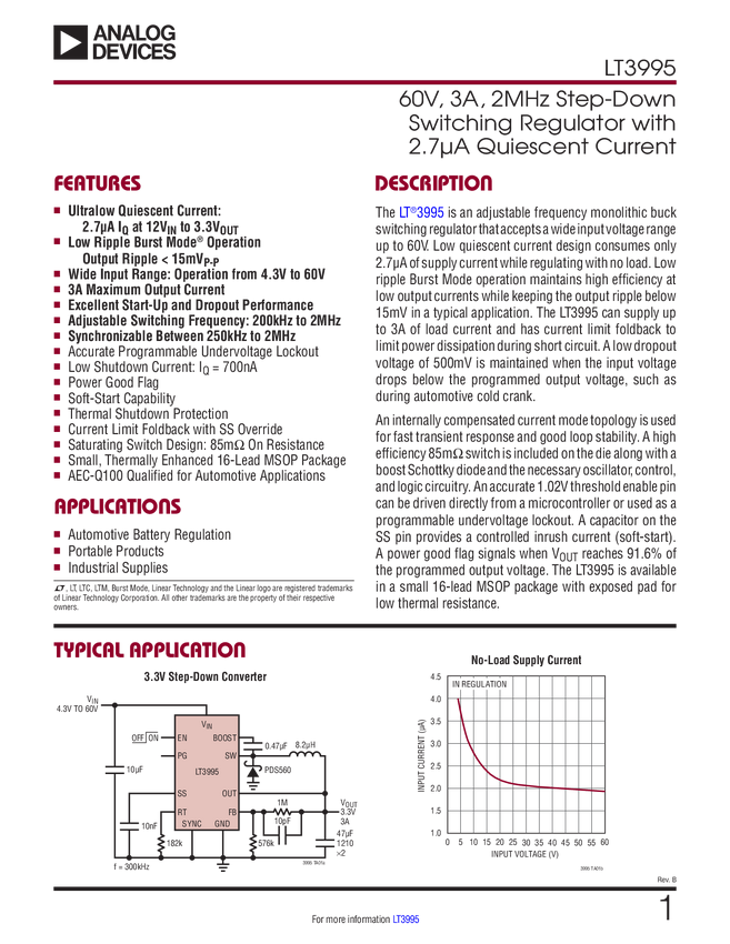 LT3995 60V, 3A, 2MHz Step-Down Switching Regulator with 2.7μA Quiescent Current