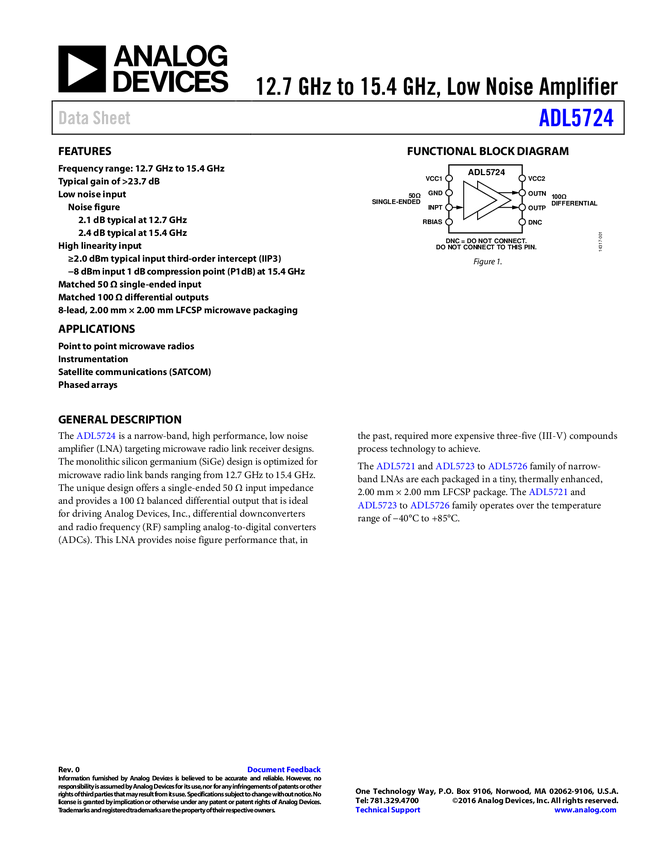 ADL5724 12.7 GHz to 15.4 GHz, Low Noise Amplifier