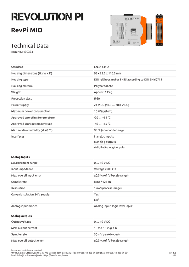 PR100323 Moduł rozszerzeń PLC Revolution Pi by Kunbus RevPi MIO PR100323 24 V/DC