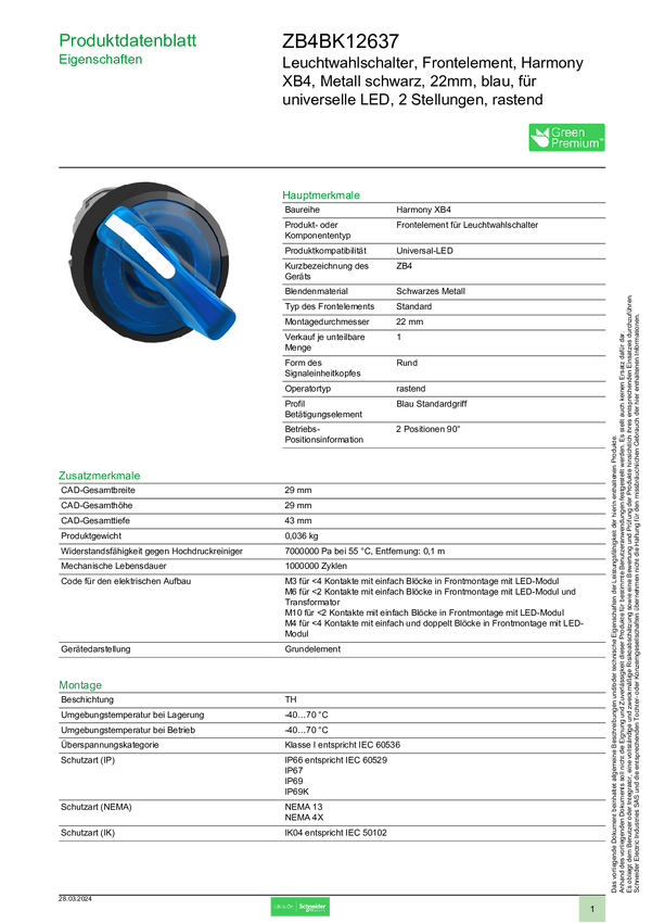 Schneider Electric ZB4BK12637 Przedni element przełącznika selekcyjnego światła 1 szt.