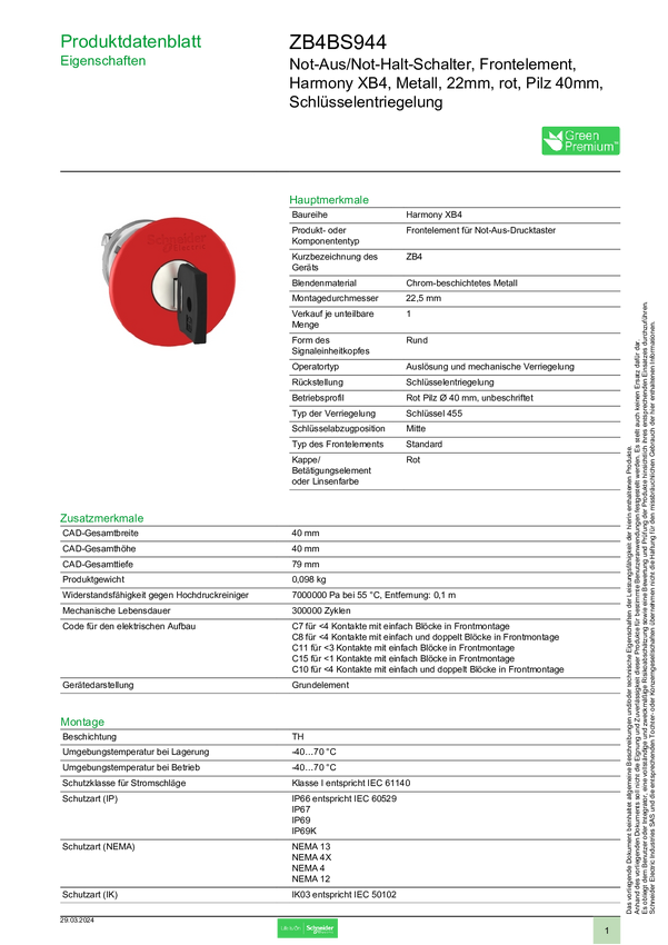 ZB4BS944 Schneider Electric ZB4BS944 Przycisk grzybkowy - przedni element 1 szt.