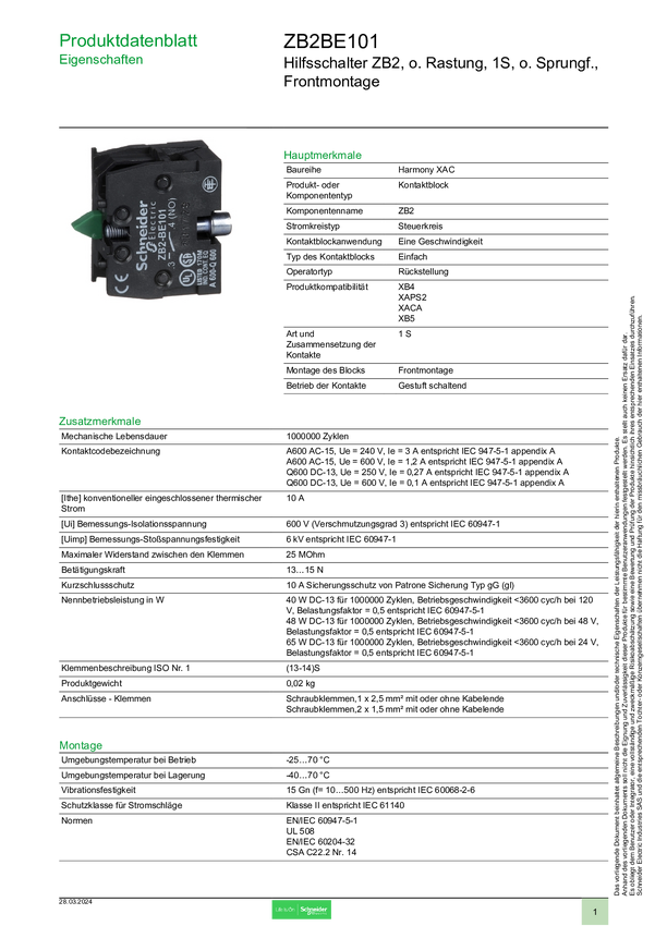 ZB2BE101 Przełącznik pomocniczy Schneider Electric ZB2BE101, 1 szt.