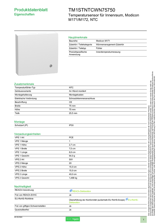 TM1STNTCWN75750 Czujnik temperatury Schneider Electric TM1STNTCWN75750