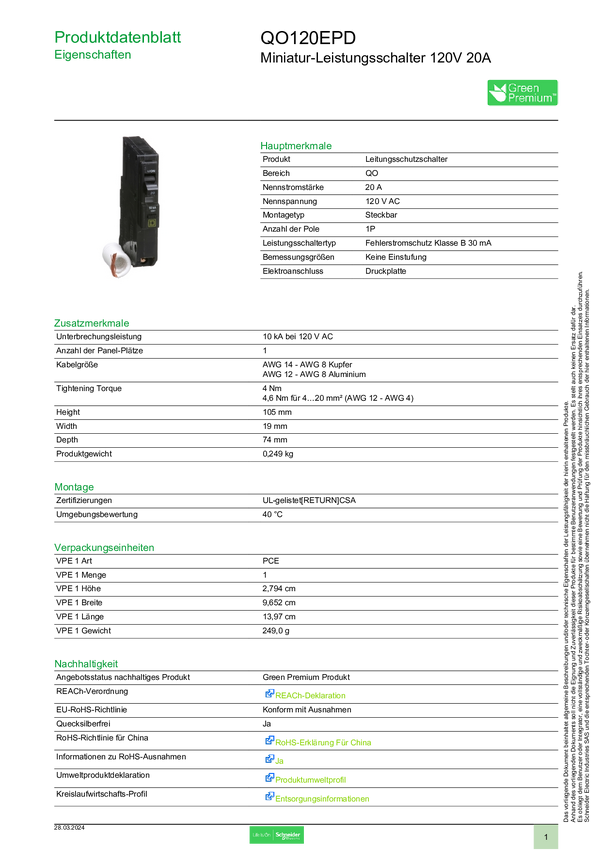 QO120EPD Wyłącznik zasilania Schneider Electric QO120EPD 1 szt.