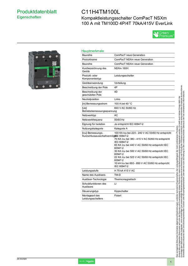 C11H4TM100L Wyłącznik zasilania Schneider Electric C11H4TM100L 1 szt.