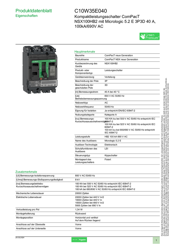 Wyłącznik zasilania Schneider Electric C10W35E040 1 szt.
